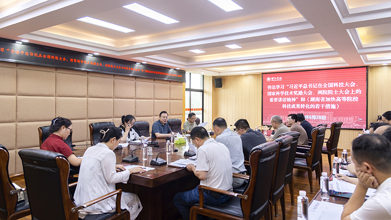 会上,科技处处长陈志刚全文传达了习近平总书记在全国科技大会、国家科学技术奖励大会、两院院士大会上的重要讲话,并汇报了我校2022年度省科学技术奖获奖情况。毛颖玲副处长领学了《湖南省加快高等院校科技成果转化的若干措施》。