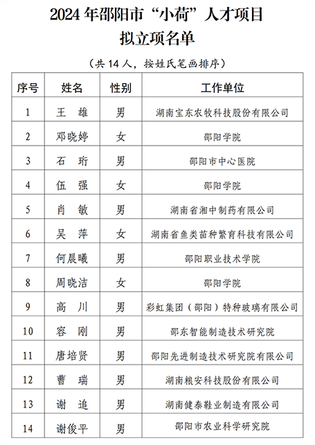 近日,邵阳市“小荷”人才项目已完成公示,经过申报、考察、推荐、评选、个人事项审查等程序,我校食品与化学工程学院邓晓婷、伍强、周晓洁三位青年博士喜获邵阳市“小荷”人才项目资助。据悉,“小荷”项目重点支持在科研生产一线投身全市“3×3优势产业”发展的35岁(含)以下的青年科技创新人才,以项目资助方式予以支持。